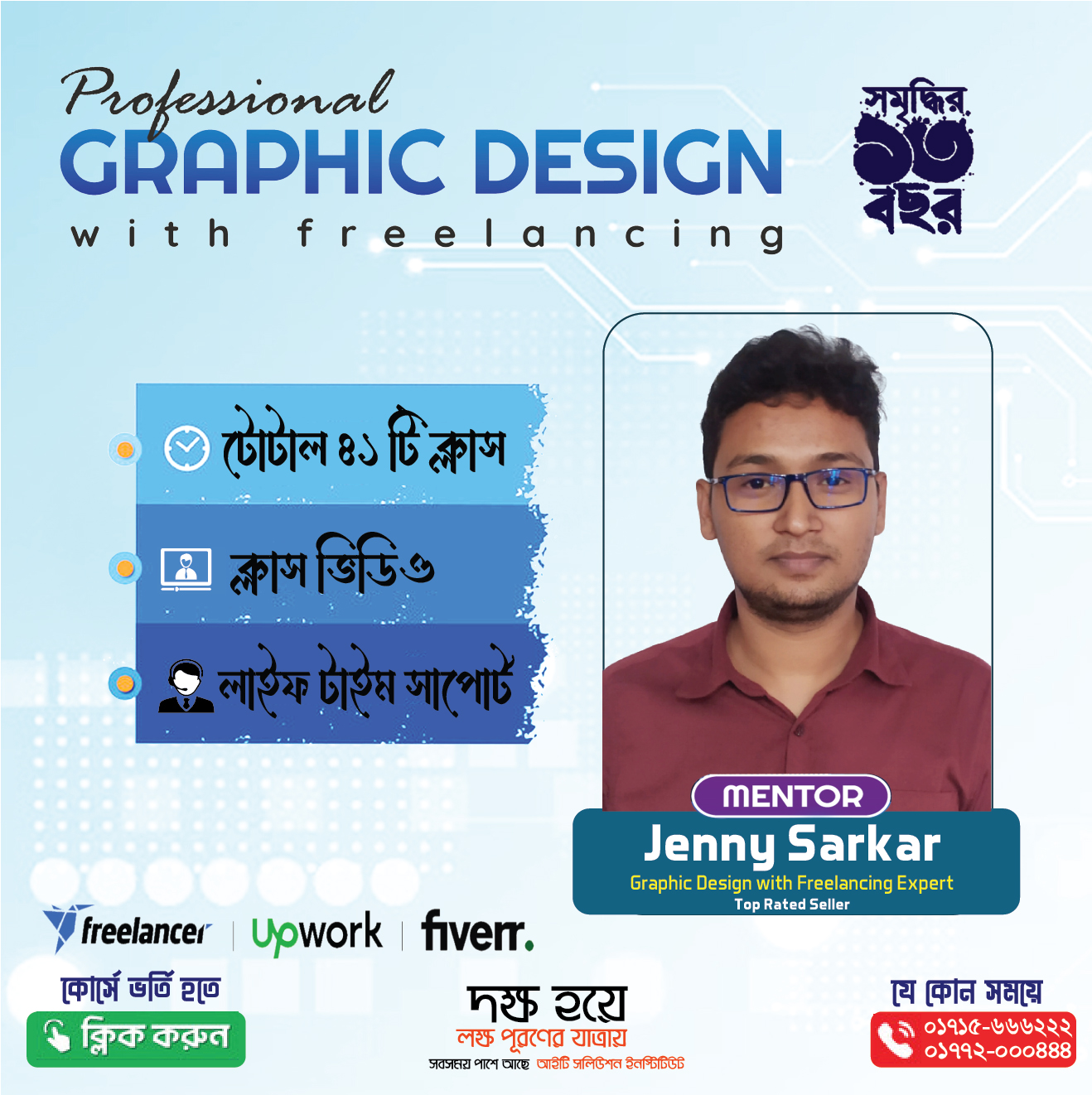 আপনার ভবিষ্যৎ ক্যারিয়ার গড়তে ও যথাযথ প্রশিক্ষণের মাধ্যমে অত্যন্ত সমৃদ্ধভাবে গড়ে তুলতে আমরা প্রতিজ্ঞাবদ্ধ। স্মার্ট বাংলাদেশ গড়ার লক্ষ্যে, আপনার ক্যারিয়ার শুরু হোক ফ্রিল্যান্সিং এর বিভিন্ন কোর্স দিয়ে। অযথা বেকার হয়ে বোঝা হবেন না। তাই ফ্রিল্যান্সিং করে স্বাবলম্বী হবার এখনই সময়। অযথা চাকরির পিছনে না ঘুরে, ফ্রিল্যান্সিং বা আউটসোর্সিং শিখে নিজে নিজে স্বাবলম্বী হোন। আমাদের এখানে রয়েছে এক—ঝাক অভিজ্ঞ মেন্টর ও সফল ফ্রিল্যান্সার।যাদের গাইডলাইন পেয়ে বর্তমানে অসংখ্য শিক্ষার্থী Fiverr, Upwork, Freelancer মার্কেটপ্লেস—এ সফলতার সাথে ইনকাম করে স্বাবলম্বী হচ্ছে। তাই আমরাই দিচ্ছি একমাত্র দুই থেকে তিন মাসের মধ্যে আয়ের গ্যারান্টি ও ১০০% কাজের নিশ্চয়তা। কোর্স চলাকালীন সময় ইনকামের গ্যারান্টি তো থাকছেই, সাথে থাকছে আমাদের ফ্রিল্যান্সিং টিম—এ চাকুরি করার সুযোগ।তাই কোথাও ভর্তি হওয়ার আগে আমাদের বিষয়গুলো জানুন, আমাদের ইনকামের প্রোফাইল দেখুন, এরপর সিদ্ধান্ত নিন। মনে রাখবেন যাচাইয়ের জন্য যেখানেই ভর্তি হোন না কেন,আগে তাদের ইনকামের প্রোফাইল দেখুন, তার পর ভর্তির সিদ্ধান্ত নিন।
